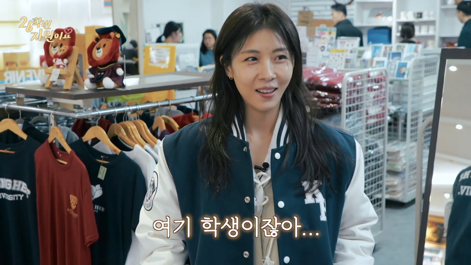 之後,她還走進校內文具店,對學院外套表現出興趣,並說:「穿這種才有我們學校學生的感覺吧」,接連試穿四種款式,現場上演即席時尚秀。「我看起來像學生吧」、「真的很適合我吧」,她自己也忍不住笑了出來。