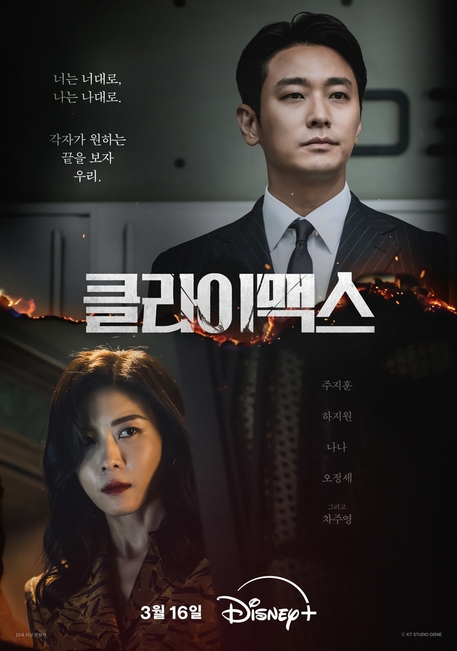Disney+確定將於3月16日首播,《Climax》公開了朱智勛與河智苑的強烈情侶海報,以及奔向權力巔峰的主預告,引發熱烈反響。