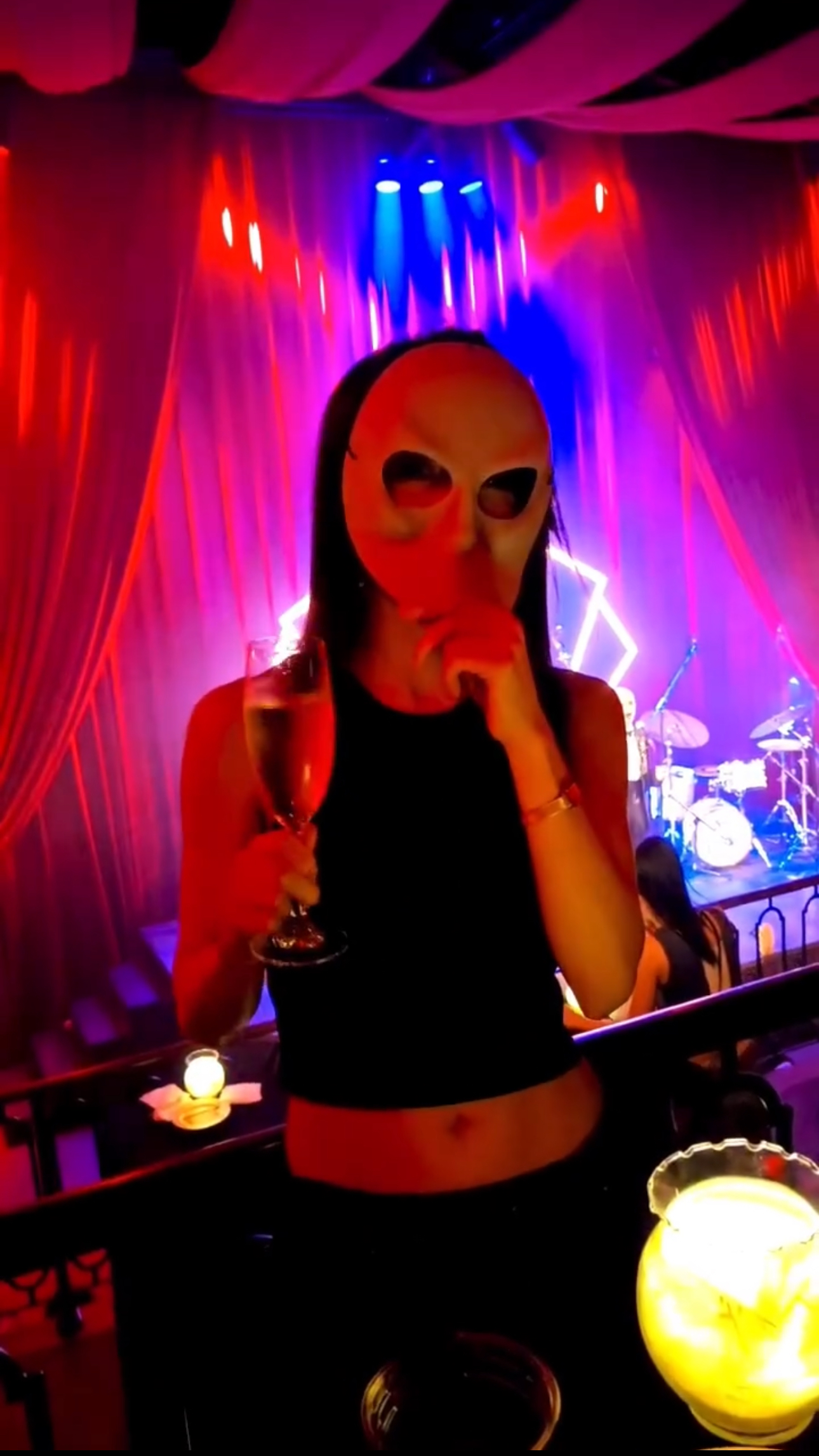 影片中,河智苑戴著面具,手持香檳,享受著氛圍。