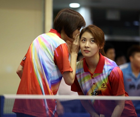 創立式後、かつて俳優たちの師匠であった韓国馬事会、農心三多数の選手たちと「コリア」チームのメンバーで構成されたダブルス親善戦が続いた。 映画の中で紅茶屋を演じた女優チェ・ユンヨンが男子代表チームの左手エースイ・ジョンウ(農心)と、「卓球団監督」イ・スナム代表が「イケメン卓球スター」ソ・ヒョウォン(韓国馬事会)とペアを組んだ。 ハ・ジウォンも久しぶりに卓球ラケットをまた手にした。 実際、ヒョン・ジョンファと映画の中のヒョン・ジョンファが「幻想のダブルス組」になった。 「ヒョン・ジョンファ役」だっただけに、最近では珍しいペンホルダーの典型だ。 「ジウォンさん、これからは同好会だよ。楽しみながらやろう。 ムン監督の言葉に笑いが吹き出した。 最初はラケットの握り方も忘れたと言っていたが、ハ・ジウォンはすぐ緑色のテーブルに適応した。 ヒョン監督が耳打ちで作戦指示をしてきた。 ハ・ジウォンがぴょんぴょん飛び回りながら楽しくスマッシュを飛ばした。 「ファイト!」顕正花札の鋭い掛け声を一緒に叫んだ。 「コリア」の希望と奇跡が再び始まった。