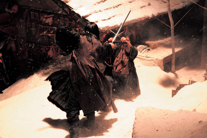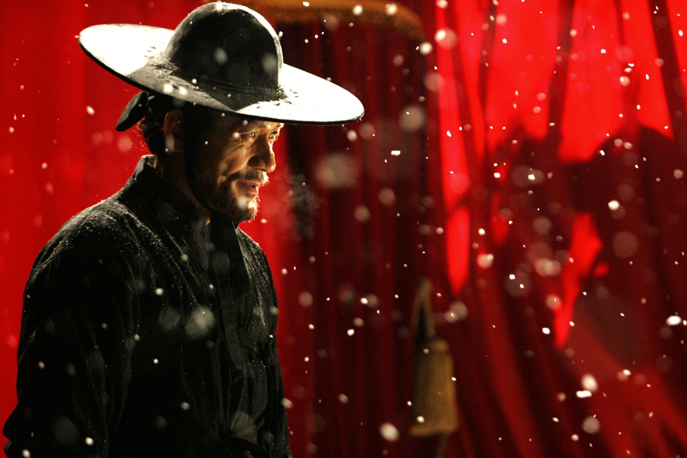 「感動」。 活動、そして律動——それらが最終的に感動へと向かっていることは、もはや言うまでもない。 『デュエリスト』には、物語そのものが足場を持たない。物語性を語ろうとする慣習的な干渉を、きっぱりと遮断する。 その代わりに、活動的なイメージが画面を満たしている。これはイ・ミョンセが長年追い求めてきたものだ。その中には、美しく華やかで、これまでどの韓国映画も試みたことのないような場面が含まれている。 たとえば、すでに古典的で教科書的とされる映画技法——ワイプやディゾルブ——を、これほどまでに柔軟かつ大胆なリズムの中で蘇らせることは、誰にでもできることではない。ナムスンと「悲しい目」が見せる律動の詩学は、完全に心に響くとは言い難いかもしれないが、それが新しい概念への挑戦であることは間違いない。 ナムスンと「悲しい目」の美しい対決シーンを除いたとしても、色彩が幾重にも重なる中で、アン捕校と兵判が映画の後半で対峙する場面は、脇役たちまでもがその“視覚の楽園”の中に堂々と存在していることを証明している。制作費78億ウォンという巨額の予算が気にかかるとはいえ、『デュエリスト』は物語ではなく、「活動するイメージ」だけで構成された、新しいアクション映画の可能性を提示しているのだ。
