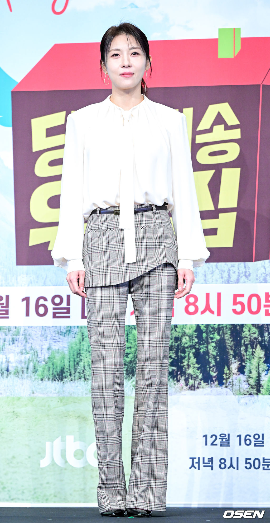 ホワイトシャツにチェック柄のパンツ姿で登場したジウォンオンニ。