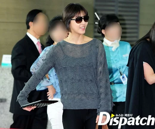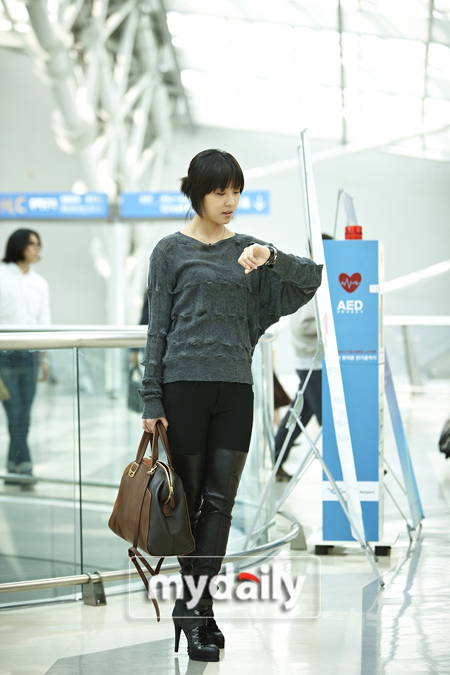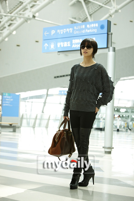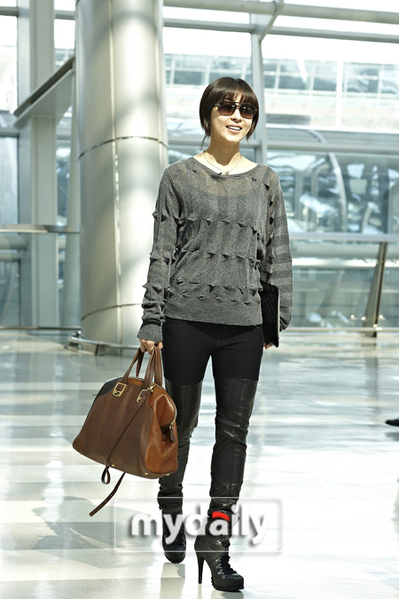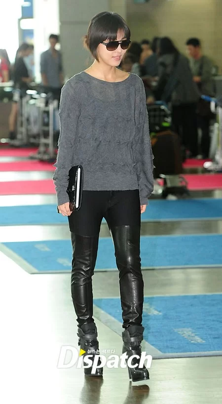 空港ファッションのコンセプトは「女戦士ルック」だった。 ハ・ジウォンはグレーカラーのシースルーニットにブラックジーンズをマッチした。 ポイントはパンツ。 太ももの上はジーンズ素材、その下は革素材でつながっている独特な素材でアンジェリーナ・ジョリーを連想させた。