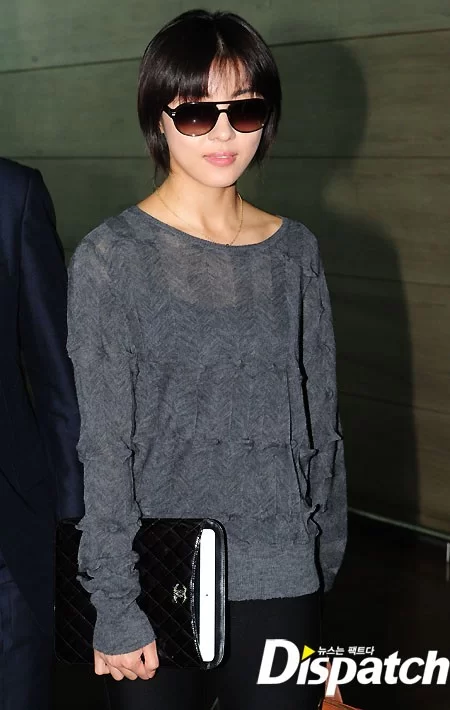 ポイントは靴。 足首の部分にストラップが2回巻かれたキルヒールアンクルブーツを履いて背が高く見えた。 シャネルの黒いノートパソコンケースをまるでクラッチバッグのように演出し、カバンを持っているような錯視効果も与えた。 空港ファッション必需品サングラスも必須。