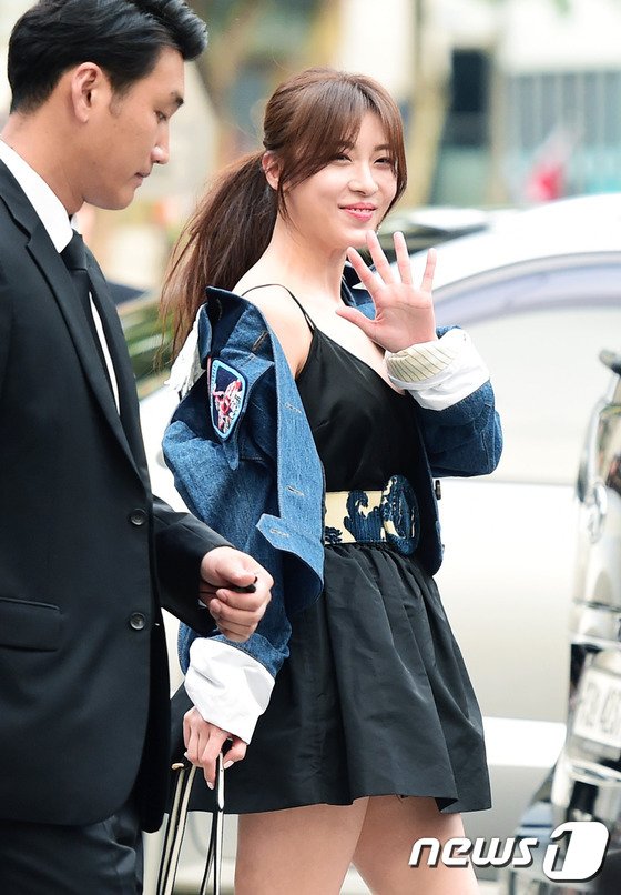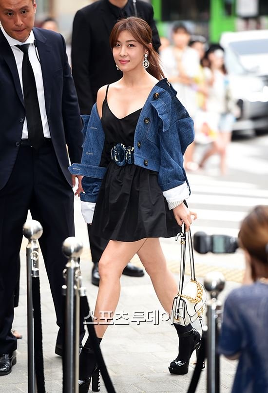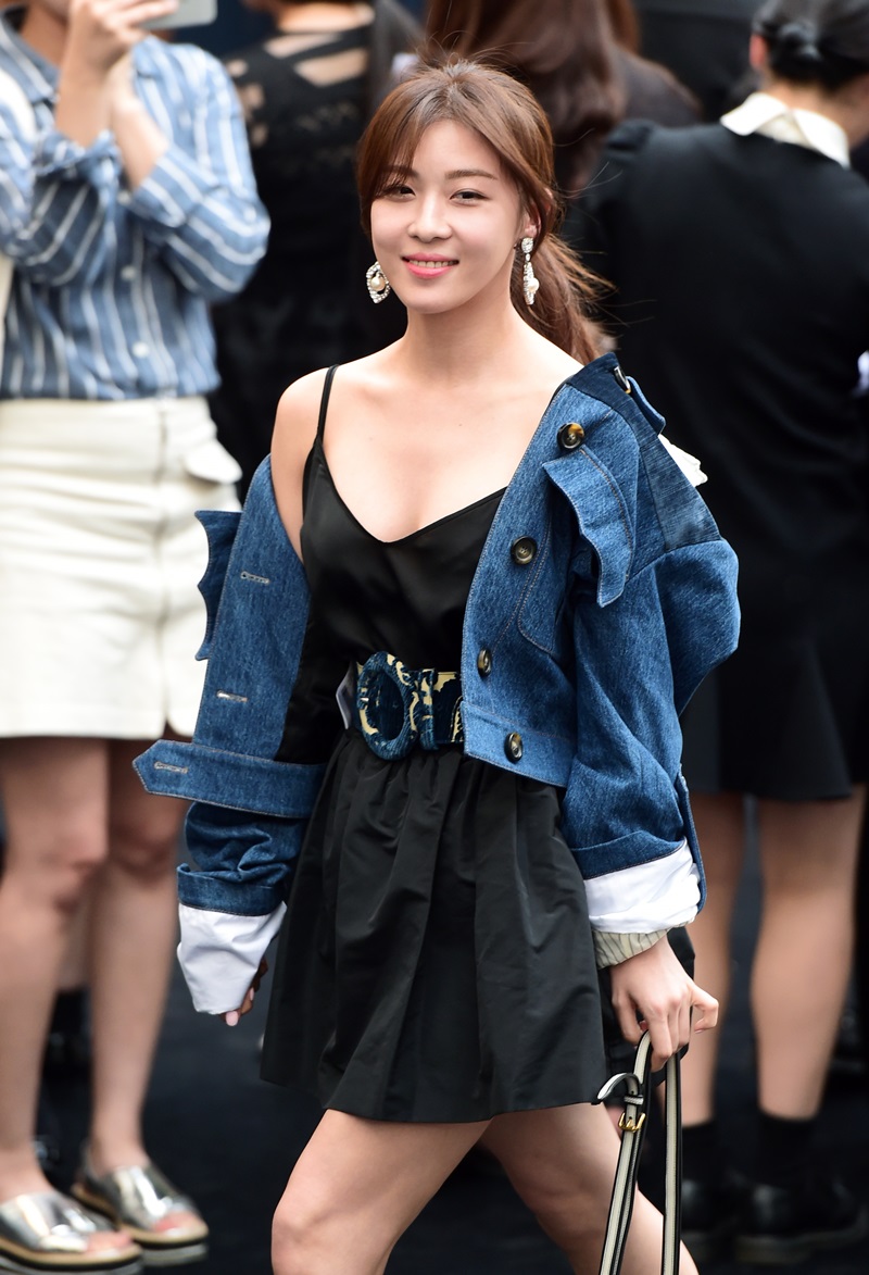 ジウォンオンニがブラックのミニワンピースとデニムジャケットで