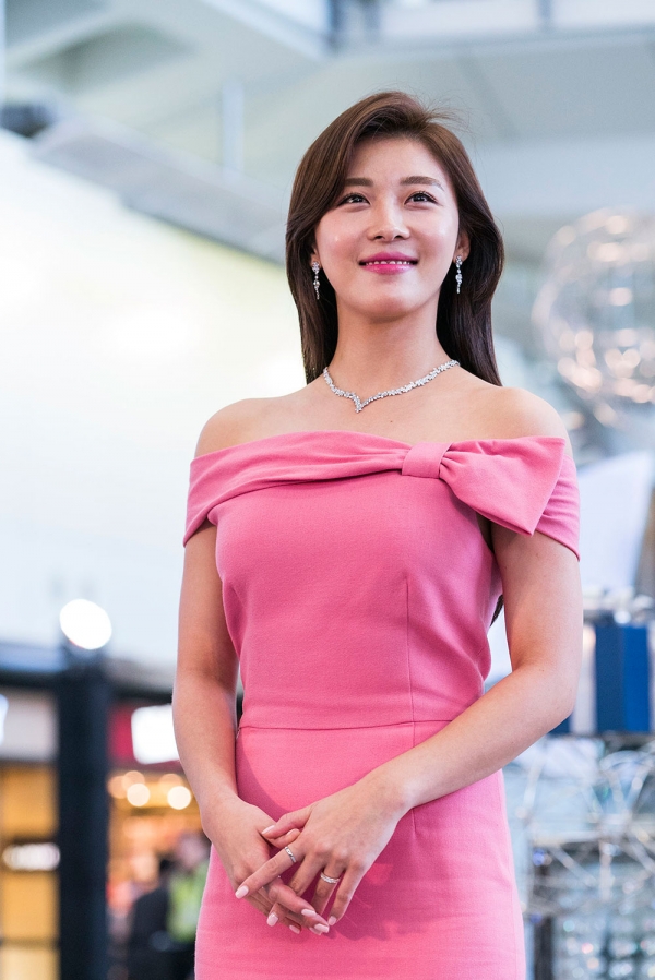 この日、ハ・ジウォンは肩が見えるピンクカラーのドレスを着てスワロフスキーのネックレスとイヤリングを着用し、独歩的な美貌を披露した。