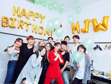 インスタにアップされたのは、赤い服を着たジウォンさんとスタッフの集合写真!