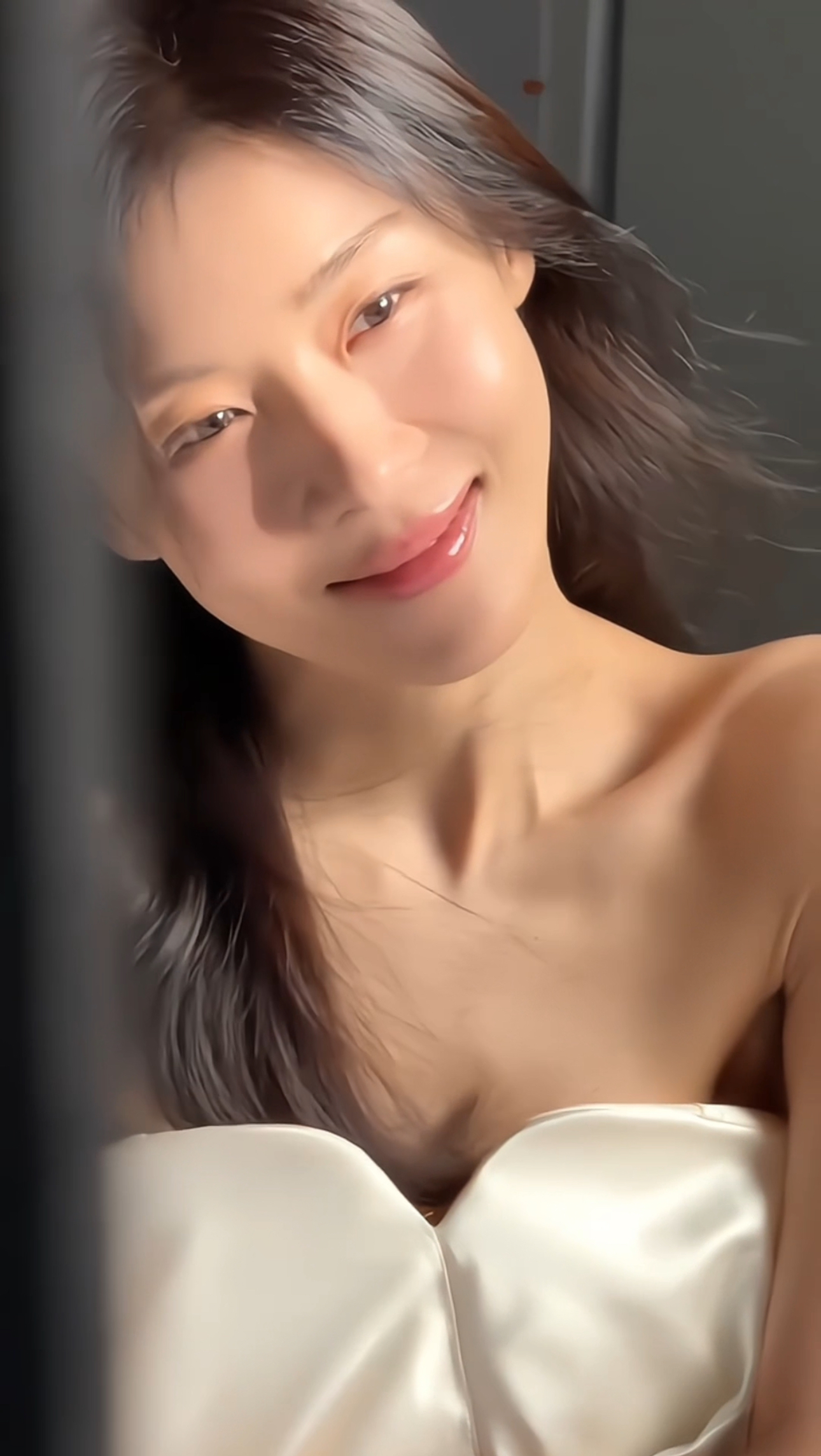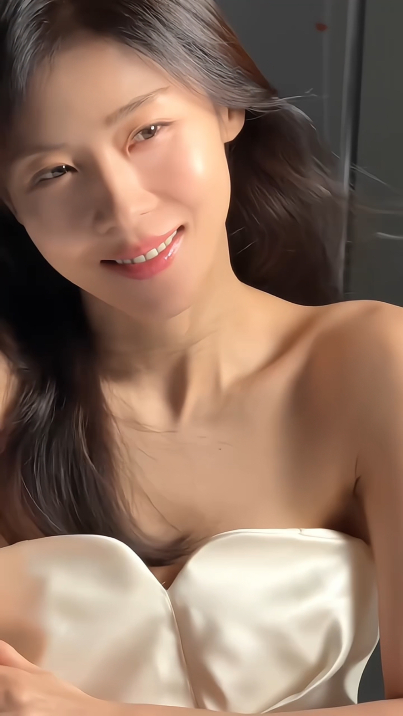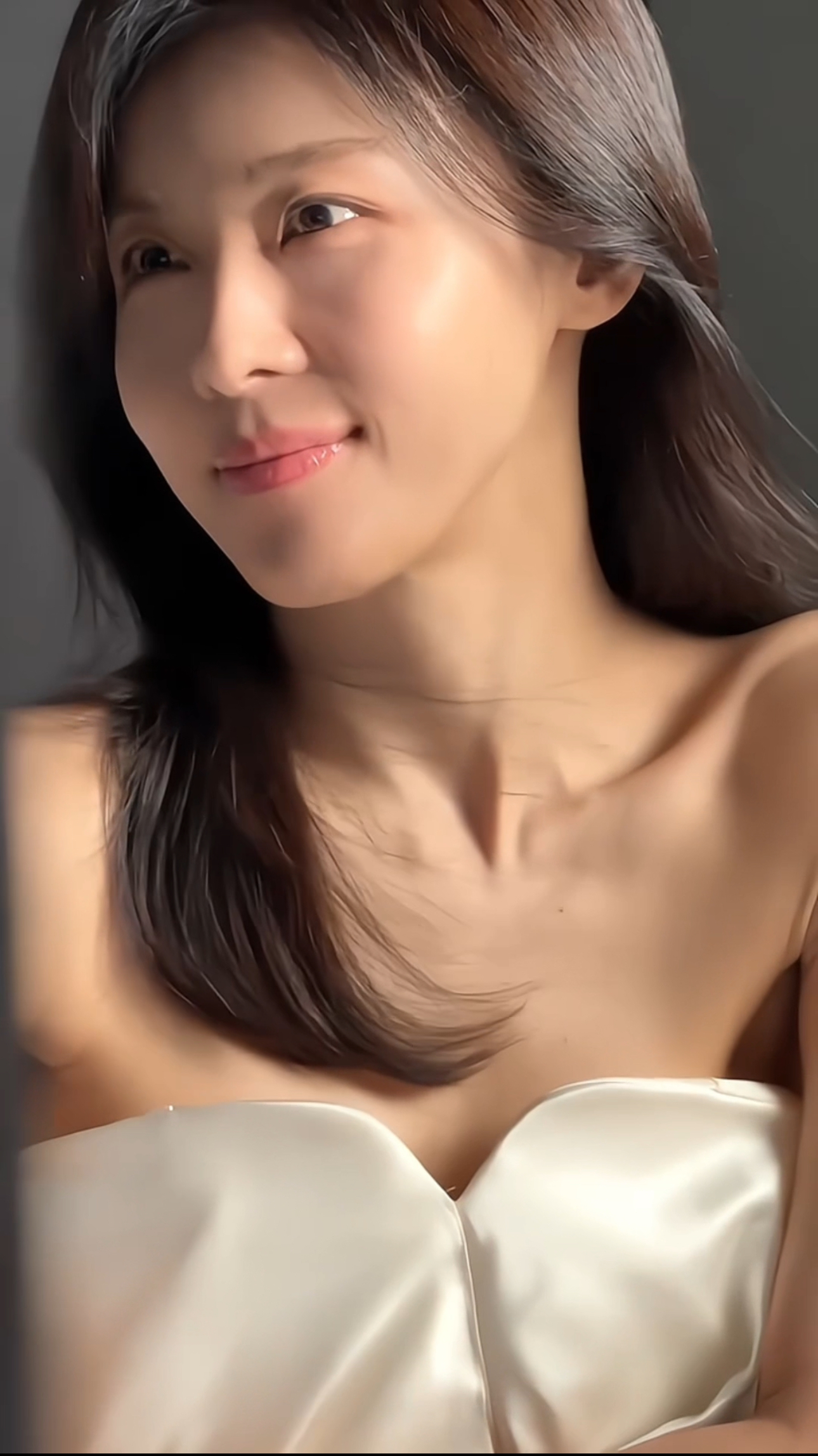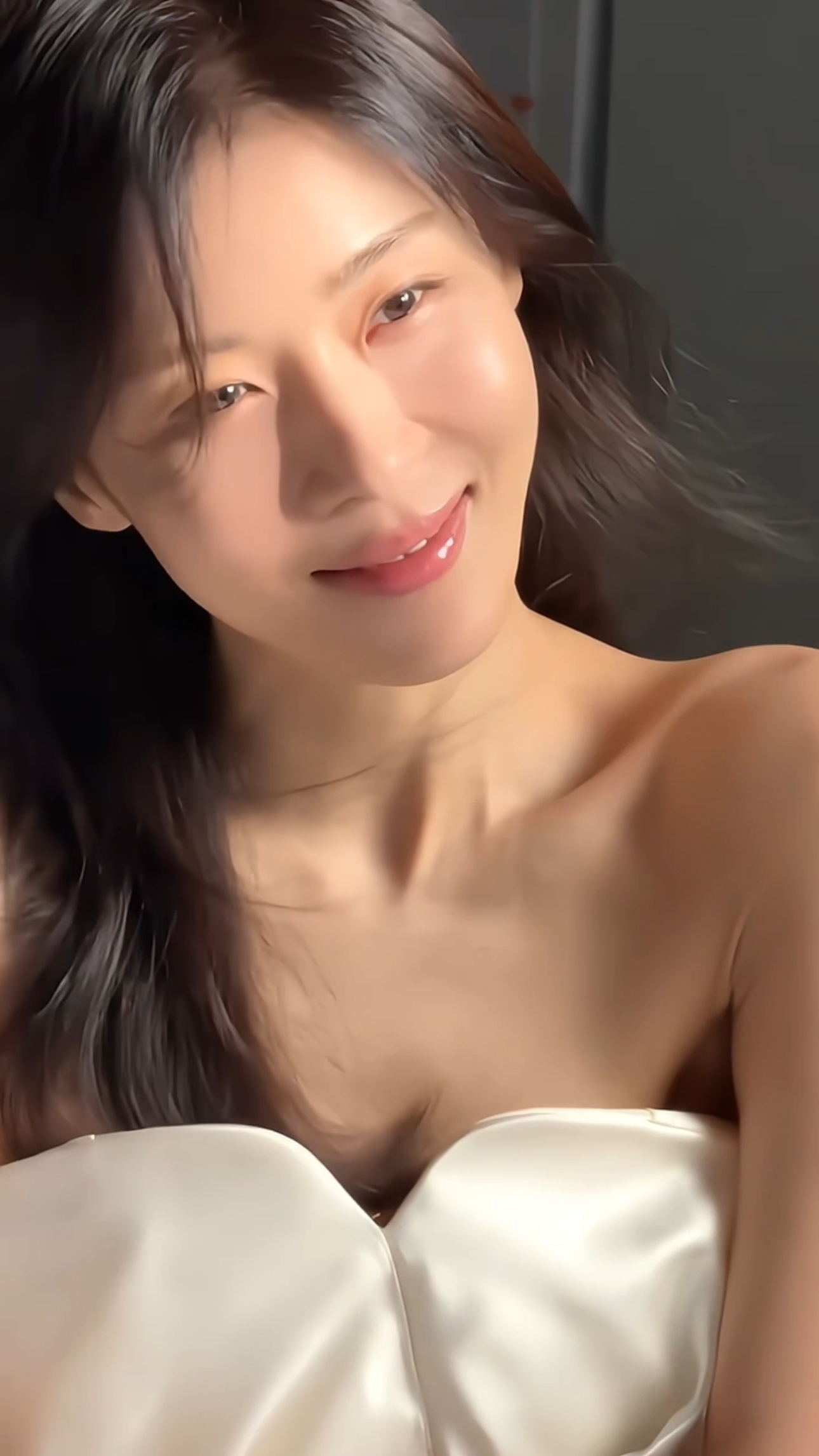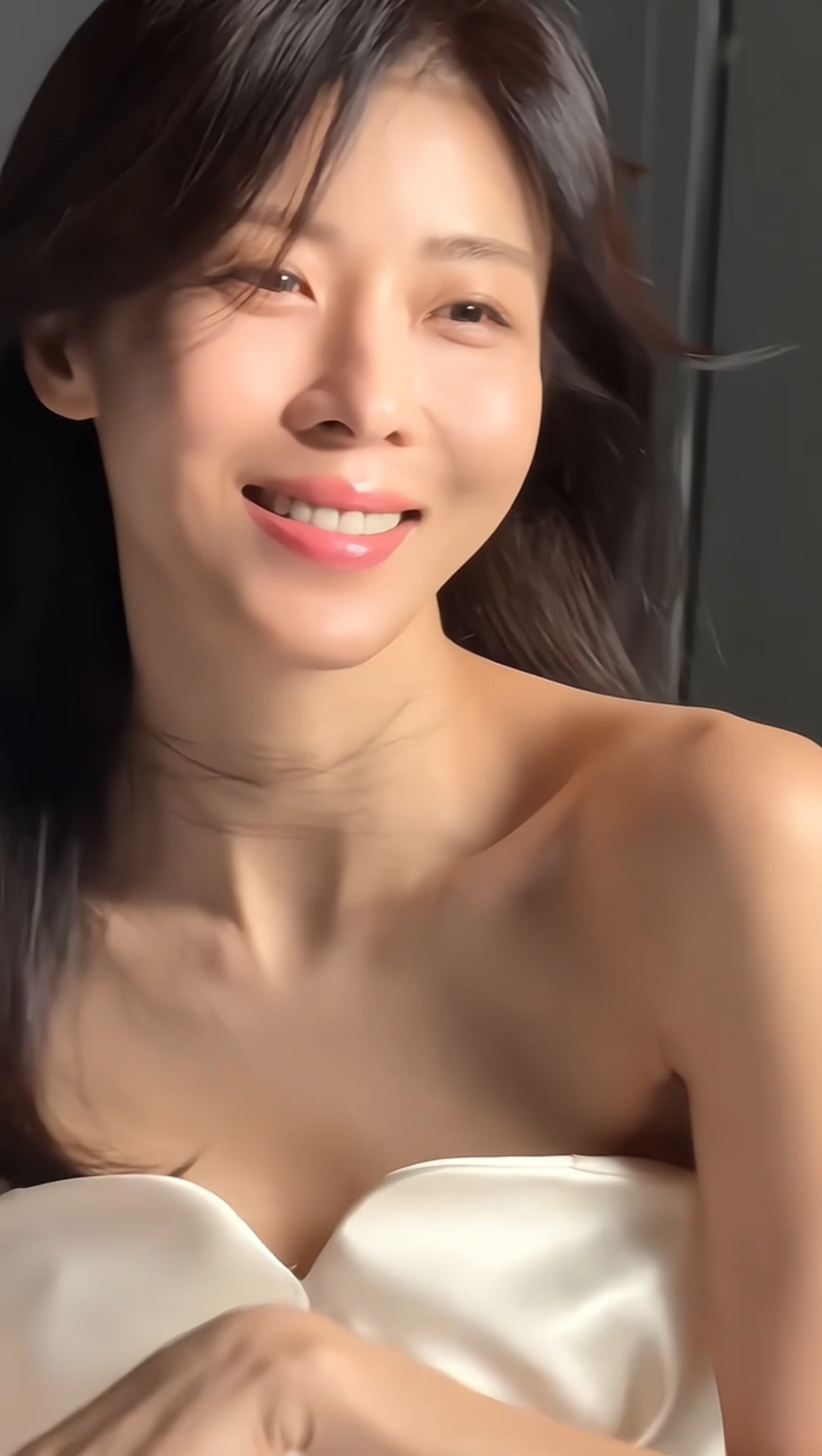 映像の中でハ・ジウォンは、肩のラインが見えるシルキーなチューブトップスタイルのオフショルダードレスを着て、明るい笑顔を見せている。