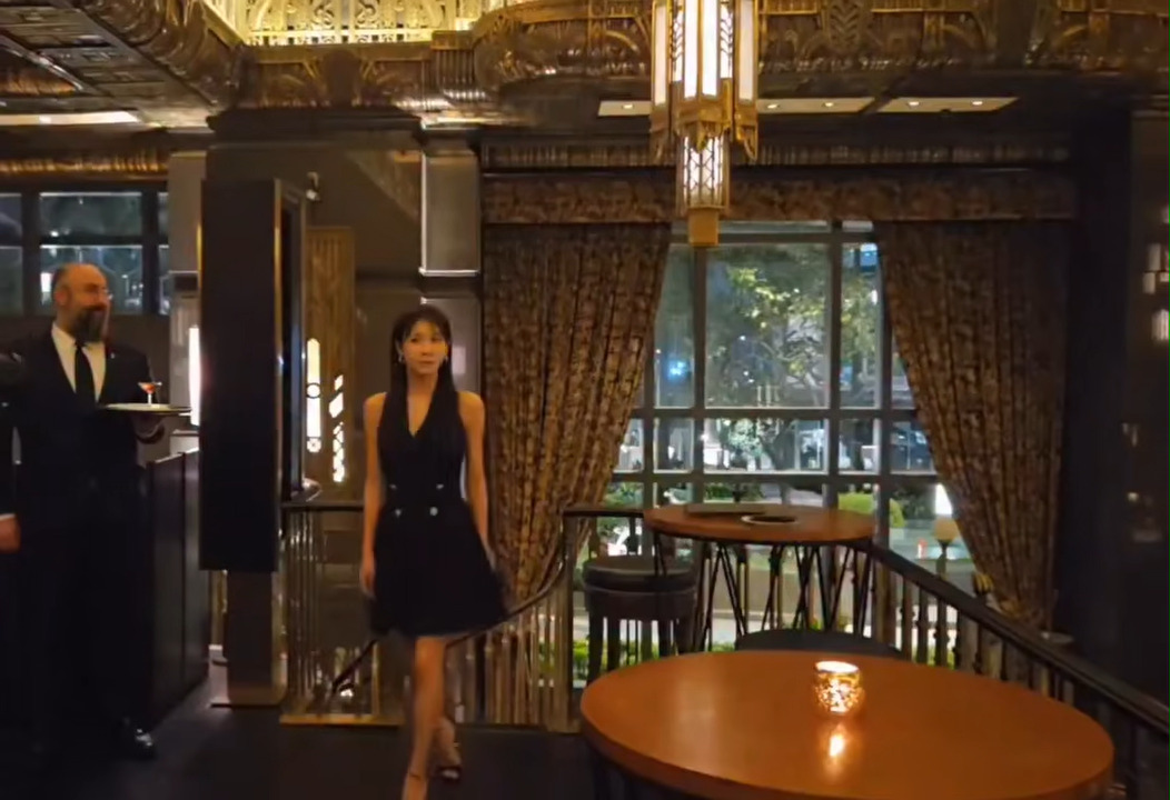 華やかな金色の装飾で満ちた高級感あふれる空間で、ブラックのノースリーブワンピースを着て椅子に座る姿が収められている。天井や壁面を埋め尽くす精巧な装飾はまるでヨーロッパの宮殿を思わせ、その中でハ・ジウォンは抑制されたポーズと雰囲気で視線を釘付けにした。