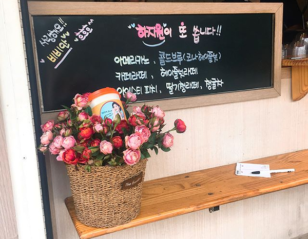 黒板に「ハ・ジウォンがまたおごります」って書いてあります。😌
