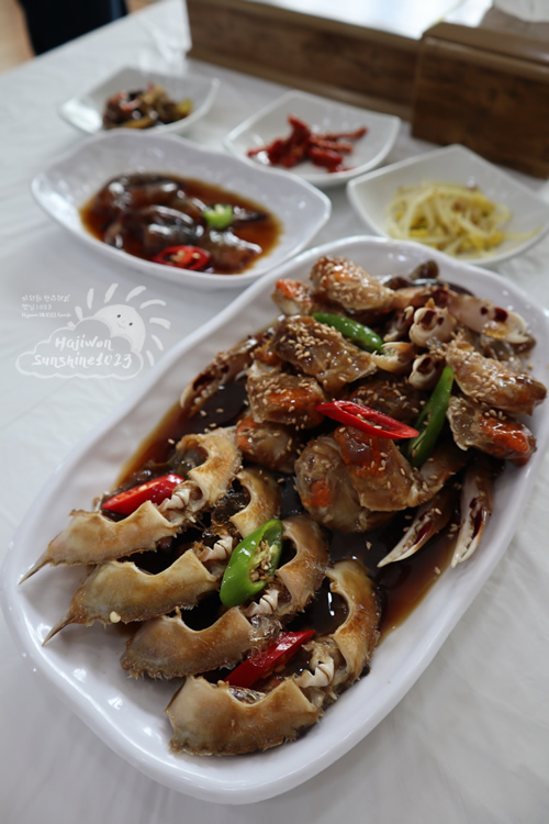 運転手さん含めて4人でカンジャンケジャン定食(2人分)と海鮮カルグクス定食(2人分)を注文しました。