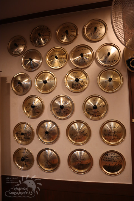 芸能人のサインが書かれた鍋のふたが壁を埋めるように飾られていて、