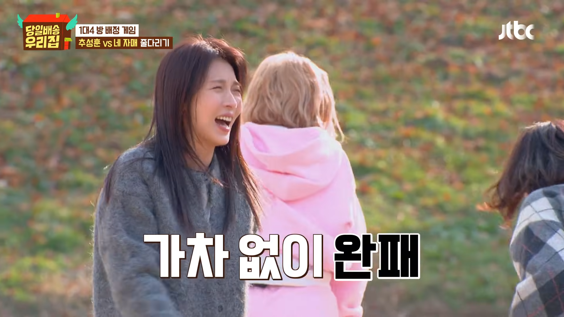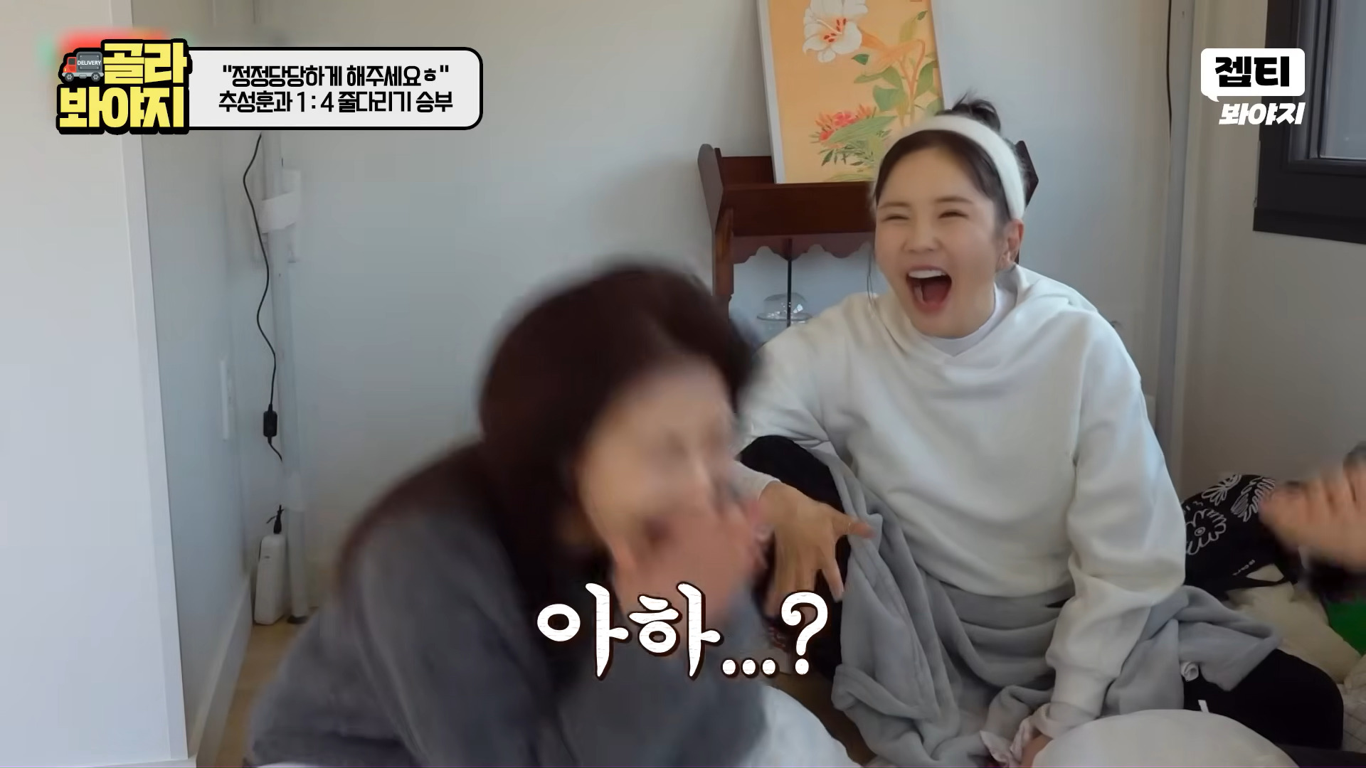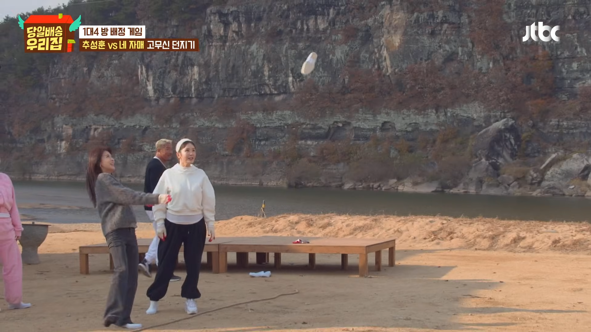 その後、ハ・ジウォン、キム・ソンリョン、チャン・ヨンラン、GABEEは部屋割りをめぐりチュ・ソンフンと4対1のフィジカルゲーム対決に突入。最初の綱引きゲームでハ・ジウォンは開始直後からチュ・ソンフンの圧倒的な力に翻弄され床に投げ飛ばされ、現場を爆笑の渦に巻き込んだ。続く「靴飛ばし」ゲームでもハ・ジウォンは最も近くに靴を落とし「ゲーム最弱体質」を再び証明、「紙人形」を超えた「薄紙人形」キャラクターを完成させた。