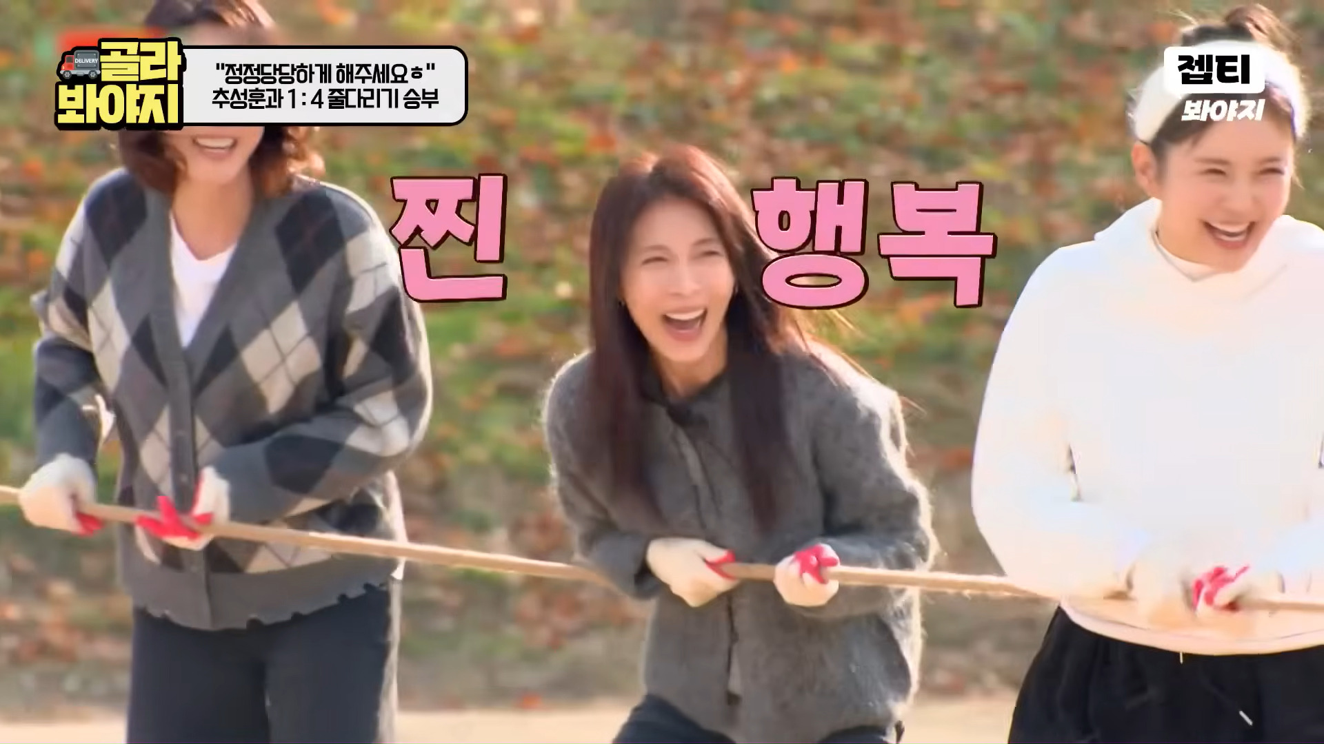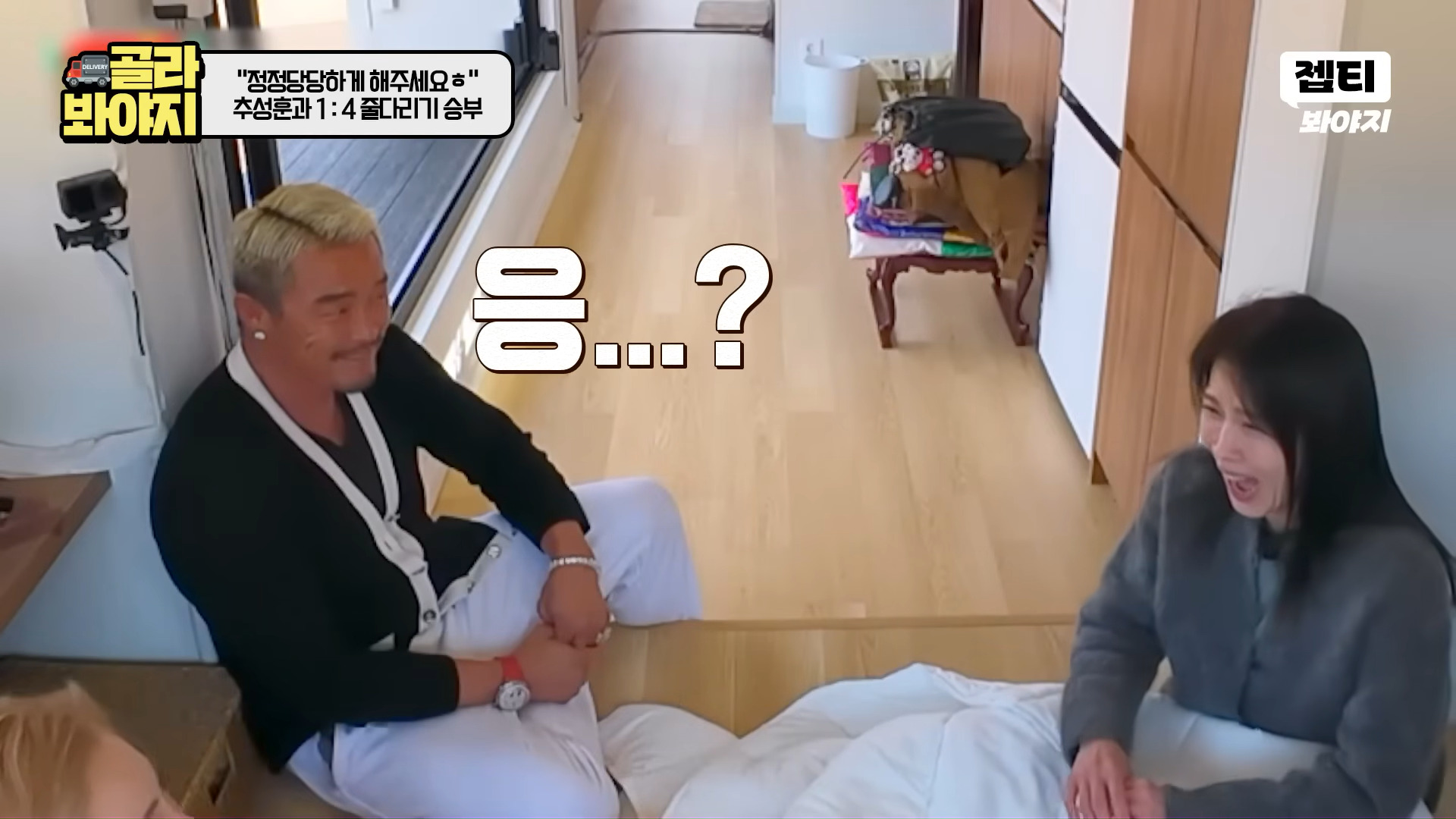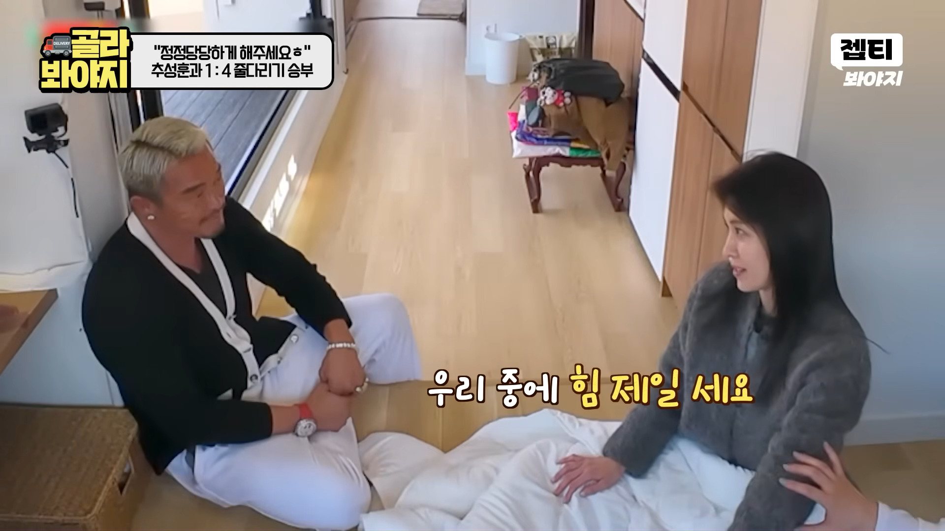 その後、ハ・ジウォン、キム・ソンリョン、チャン・ヨンラン、GABEEは部屋割りをめぐりチュ・ソンフンと4対1のフィジカルゲーム対決に挑んだ。最初の綱引きゲームでハ・ジウォンは開始直後からチュ・ソンフンの圧倒的な力に翻弄され床に投げ飛ばされ、現場は爆笑の渦となった。